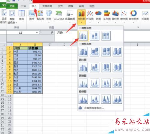 1、選中數據源,這里是A1:B13,在菜單中選擇“插入選項卡——柱形圖——二維柱形圖”