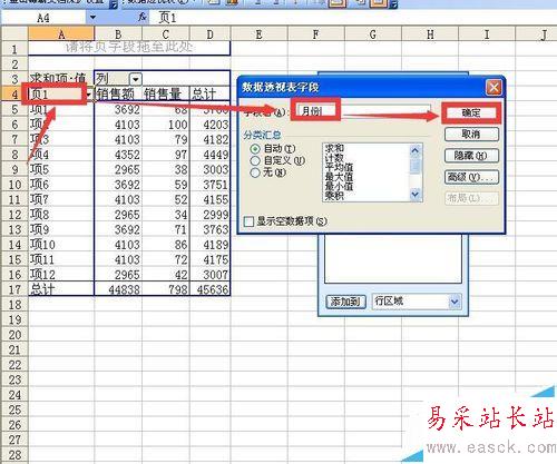 4、這是新建好的數(shù)據(jù)透視表,首先將行字段拖走,然后將頁字段拖動到行字段的位置,通過拖動單元格邊緣將項1到項12重新按順序排列,通過雙擊頁字段所在單元格調(diào)出數(shù)據(jù)透視表字段對話框,將該字段名改為月份,然后將月份字段下的每個項目改為相應(yīng)的月份,然后通過拖動單元格邊框?qū)⒃路輳?月排到12月。