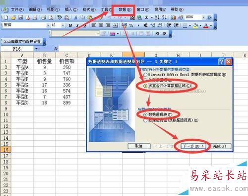 2、點按命令欄數(shù)據(jù)命令,在彈出的菜單中點按數(shù)據(jù)透視表和數(shù)據(jù)透視圖命令,在彈出的數(shù)據(jù)透視表和數(shù)據(jù)透視圖向?qū)?步驟之1中點選多重合并計算數(shù)據(jù)區(qū)域,然后點選數(shù)據(jù)透視表,然后點按下一步,在下一個對話框中點選創(chuàng)建單頁字段,然后繼續(xù)點按下一步