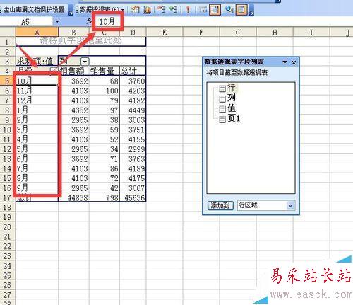 5、然后鼠標(biāo)左鍵按住月份字段拖動到列字段然后松開鼠標(biāo),注意在松開鼠標(biāo)時候的位置如果在箭頭指向的列的左側(cè)箭頭指向的紅色框內(nèi),月份將位于列的左側(cè),如果松開鼠標(biāo)時的位置位于列的帶有下拉三角標(biāo)志的位置,月份將位于列的右側(cè),位于左側(cè)的是上級字段,位于右側(cè)的是下級字段,這里應(yīng)該讓月份在左側(cè)作為上級字段。