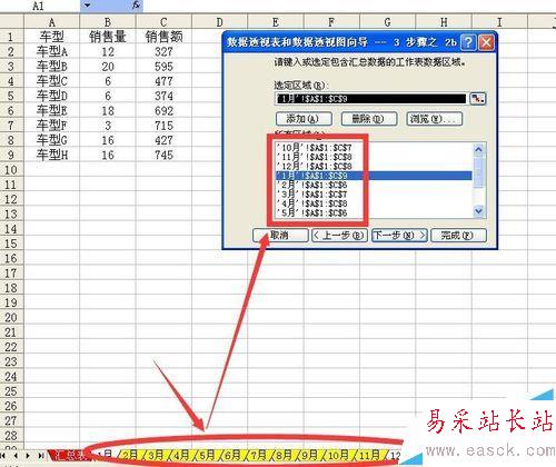 3、在接下來彈出的數(shù)據(jù)透視表和數(shù)據(jù)透視圖3步驟之2b中點按一月工作表標(biāo)簽然后選擇該表中如圖所示的數(shù)據(jù)區(qū)域,然后點按添加按鈕,將所有的12個工作表中的數(shù)據(jù)區(qū)域均添加完成后檢查一下添加區(qū)域的順序,然后點按下一步,然后在數(shù)據(jù)透視表和數(shù)據(jù)透視圖向?qū)?步驟之3中點選新建工作表,然后點按完成。
