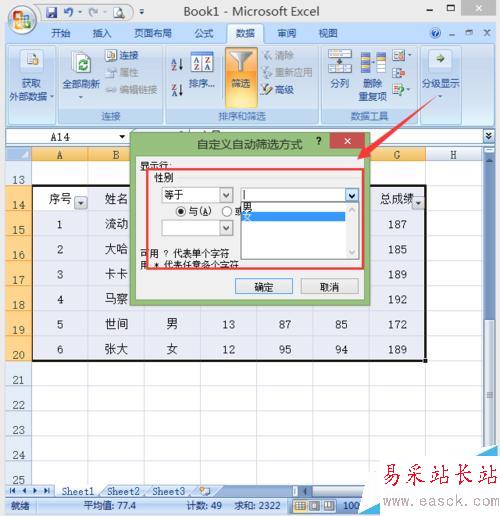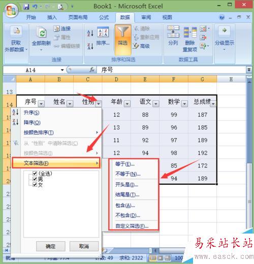 法二:點擊“性別'旁邊的小三角,選擇“文本篩選”,選擇“等于”,按自己的篩選條件進行設置即可。