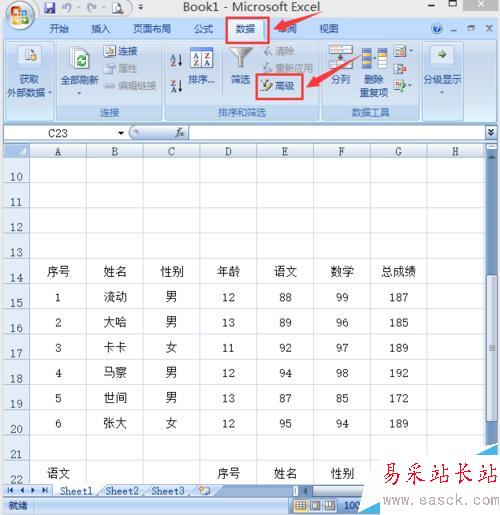 3、假定 需要按語文成績篩選。在任意空白位置,輸入自己的條件,比如,篩選出成績大于90的。點擊“數據”,選擇“高級”。