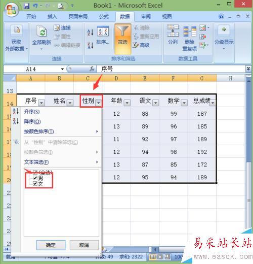 法一:點擊“性別'旁邊的小三角,可以通過勾選條件之前的勾選框進行篩選。