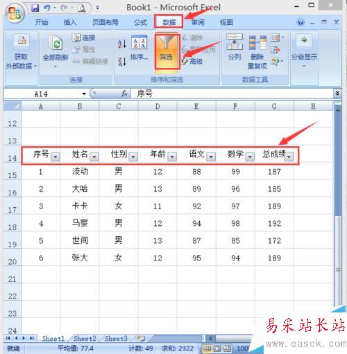 1、打開excel,找到自己的工作表內容。 選擇表格內容,點擊“數據”,選擇“篩選”,表格的標題行都會有小三角出現。
