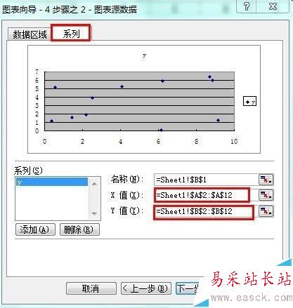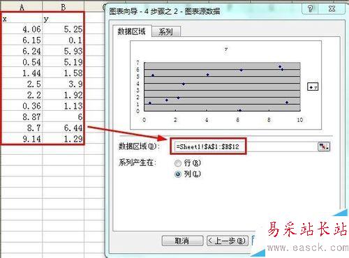 2、選擇圖表的源數據。這里點擊“數據區域”末尾的按鈕,可以把樣本數據選入。如圖2。如果自變量(X值)和因變量(Y值)在坐標系中顛倒,那么還可以通過“系列”來調整,具體可以見圖3。