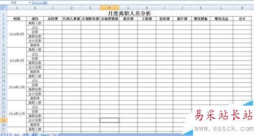 假設我們在同一個工作薄中建了一張新的工作表“統計”,跨表統計。其中所有在職人員信息在工作表“總表”中,離職人員信息在工作表“離職”中。