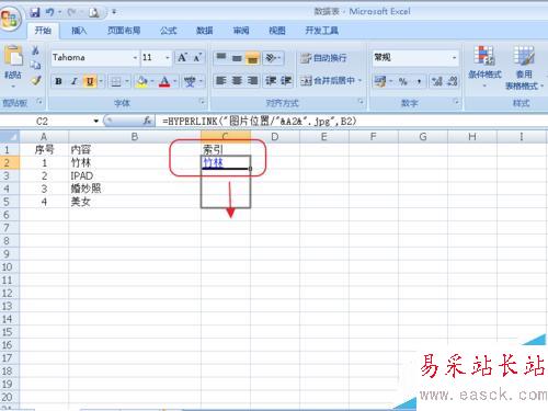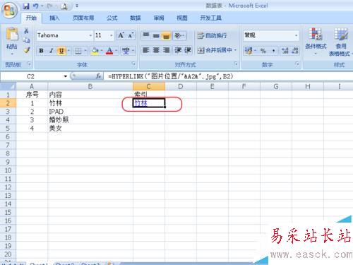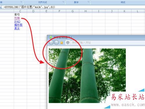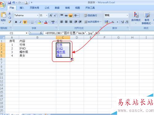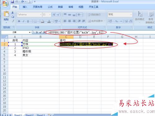 因為我在同一文件夾內做的,所以這個位置就特別簡單,"圖片位置/"&A2&".jpg”表示以序號命名的jpg格式的文件,如果用其他格式,要把這個改一下。如png格式的文件,可以寫成"圖片位置/"&A2&".png" 后面的B2表示,顯示B2文字,你也可以用其他的,如“點擊打開圖片”