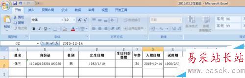 5、在單元格G2輸入入職日期,則H2、I2、J2、K2會(huì)自動(dòng)生成所需信息(為輸入入職日期前顯示的信息為以計(jì)算機(jī)默認(rèn)初始時(shí)間到現(xiàn)在的核算值);如果新增人員,則下拉單元格公式即可。