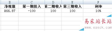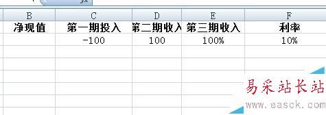 1、錄入數據。NPV的計算需要三個變量,分別是每期現金流(可為正數也可為負數)、期數(可為日、月、季、年)、利率(可為日、月、季、年)。如圖所示,第一期投入為100,后兩期收入為100,期數為3,利率為10%。