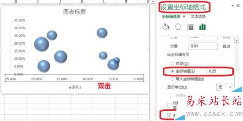 3、雙擊——設置坐標軸格式——縱坐標軸交叉坐標軸值0.25——逆序刻度值。