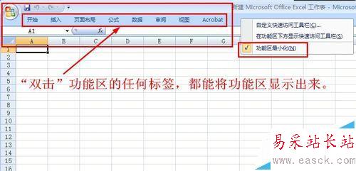 2、如果要快速顯示功能區,即在功能區任意位置按右鍵,取消鉤選“功能區最小化”。或者“雙擊”功能區的任何標簽,都能將功能區顯示出來。