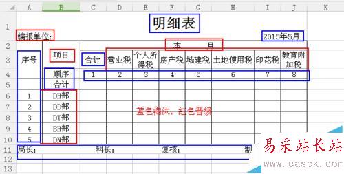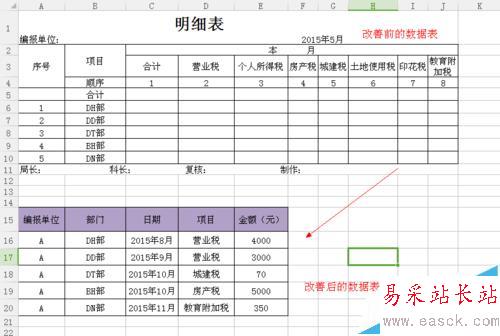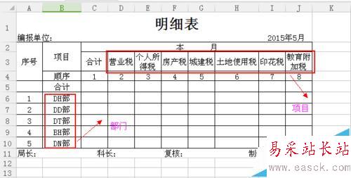 3、將保留下來(lái)的信息歸類,同屬性的用一個(gè)字段代替,例如:”營(yíng)業(yè)稅“”房產(chǎn)稅“”印花稅“等都?xì)w于”項(xiàng)目“。如下圖
