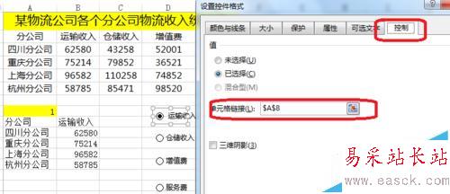 3、右擊——設置控件格式——單元格鏈接(A$8$),從上面可以看出A$8$所在單元格的值為1,鏈接的是運輸收入62580那一列,為2時,鏈接倉儲收入43258那一列。