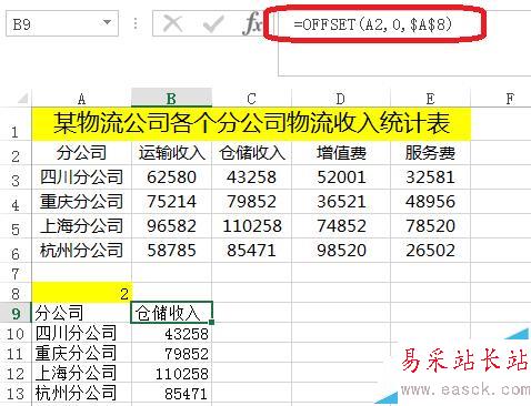 2、要做成上圖的效果,輸入公式=OFFSET(A2,0,$A$8)。然后下拉復制公式就行。