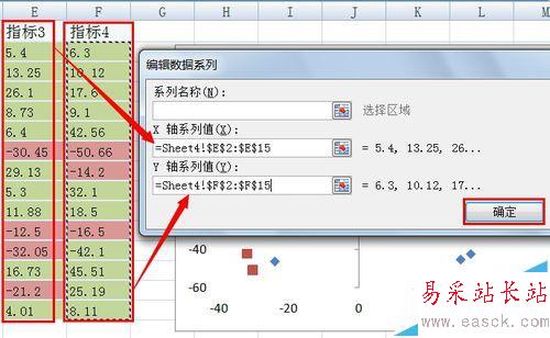 5、分別將E列數(shù)據(jù)添加到X軸系列值,F(xiàn)列數(shù)據(jù)添加了Y軸系列值,并單擊確定即可,此時(shí)原對(duì)話框中多出了一個(gè):系列2,點(diǎn)擊確定完成數(shù)據(jù)的添加。
