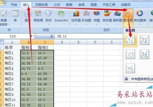 2、選擇B:C兩列數(shù)據(jù),不要帶標(biāo)題部分,插入散點(diǎn)圖: