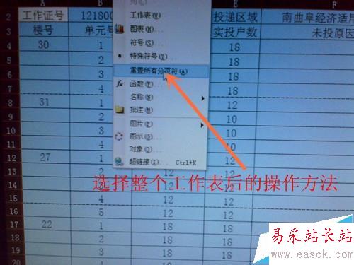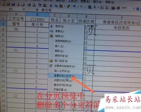 5、如果分頁較多,要刪除分頁符,也可以在“分頁預覽”視圖中,右擊任意單元格,在彈出的快捷菜單中選擇“重置所有分頁符”刪除分頁符。