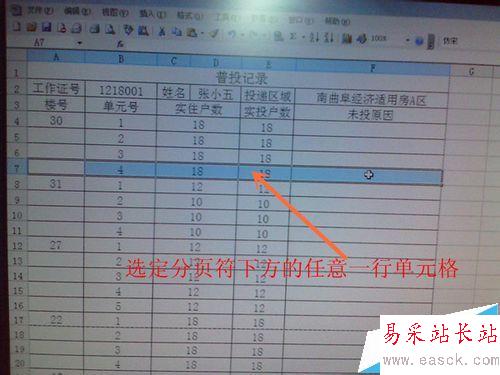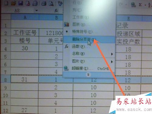 2、選定你要刪除的水平分頁符的下方任何一單元格。即虛線下方的任意一行單元格。比如分頁符在第7行下方,你就可以選定第7行下方的任意一行。選定該行后,點擊菜單任務欄中的“插入→刪除分頁符”,分頁符就刪除了。