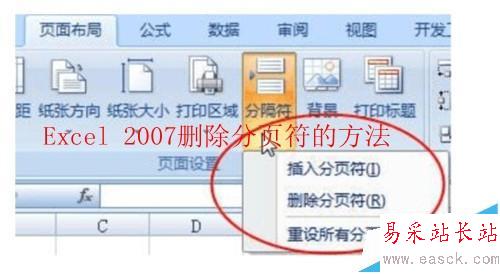 6、在Excel 2007中,插入和刪除分頁符的操作是在功能區中選擇“頁面布局”選項卡,然后在“頁面設置”組中,單擊“分隔符”按鈕,在下拉列表中進行選擇。其他的操作方法與Excel 2003相同。
