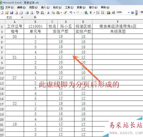 1、在Excel中插入分頁符后,在強制分頁的第一行有一行虛線,如圖: