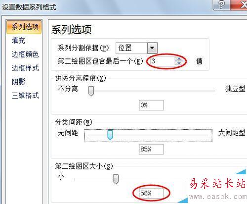 4、刪除右側的圖例,在圖表上右鍵選擇:設置數據系列格式,彈出“設置數據系列格式”對話框并做如下設置:第二繪圖區包含最后一個:3,調整第二繪圖區的大小,然后關閉對話框。