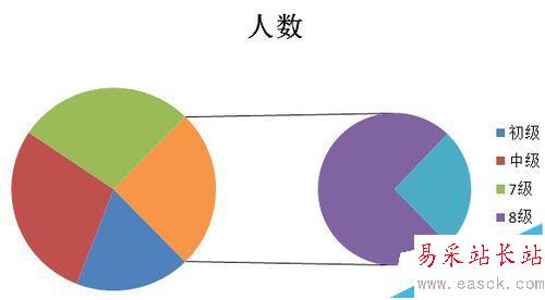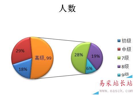1、現有如下數據,想用餅圖來體現各級別的人數情況,同時也想把高級中7-8-9三個級別的明細人員也體現出來,該怎樣制作餅圖呢?