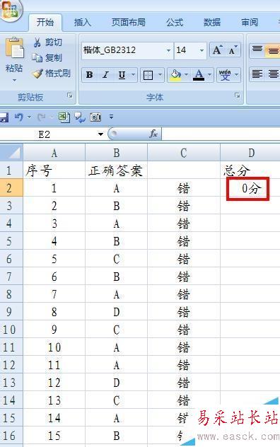3、選擇D2單元格,輸入=COUNTIF(C2:C16,"對")*4&"分",統計出1到15題中正確答案的個數,并乘以每小題得分就可以算出總分了。現在顯示是0分。