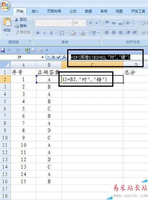2、選擇C2單元格,輸入=IF(閱卷1!B2=B2,"對","錯"),用填充手柄把C列中的其他單元格也填充好,回車你可以看到顯示的都是錯誤。