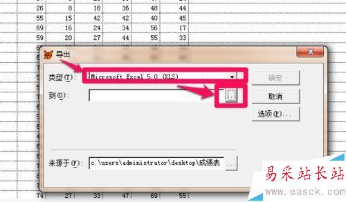 3、在類型里選擇”Microsoft Excel 5.0(xls)“,在到中選擇導(dǎo)出到哪里。