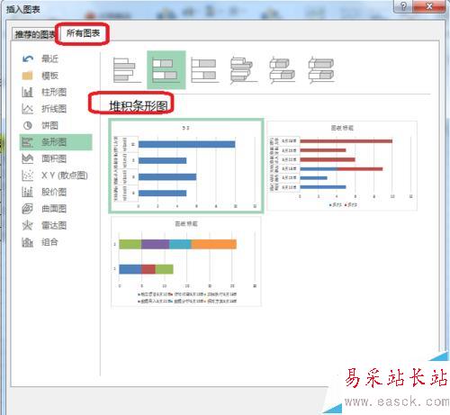 1、選中表格數(shù)據(jù)(紅色框區(qū)域)——點(diǎn)擊插入——推薦的圖表——條形堆積圖。