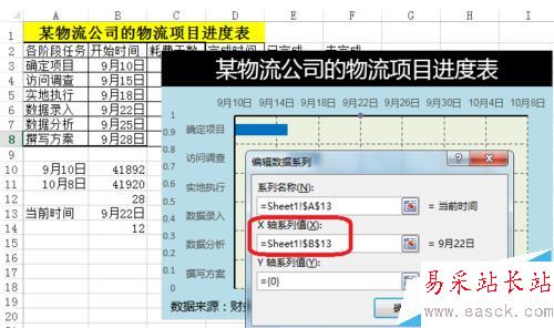 4、點(diǎn)擊選擇數(shù)據(jù)——編輯當(dāng)前時(shí)間的圖例——X軸系列值為時(shí)間9月22日。