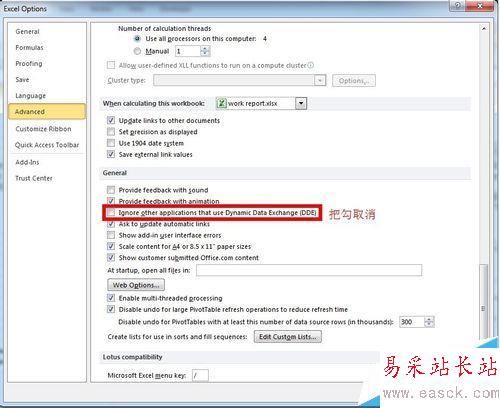 3、單擊“高級”后,在右側區域找到“常規”,將“忽略其他使用動態數據交換 (DDE) 的應用程序”的勾取消,確定后重新開啟Excel2010即可。