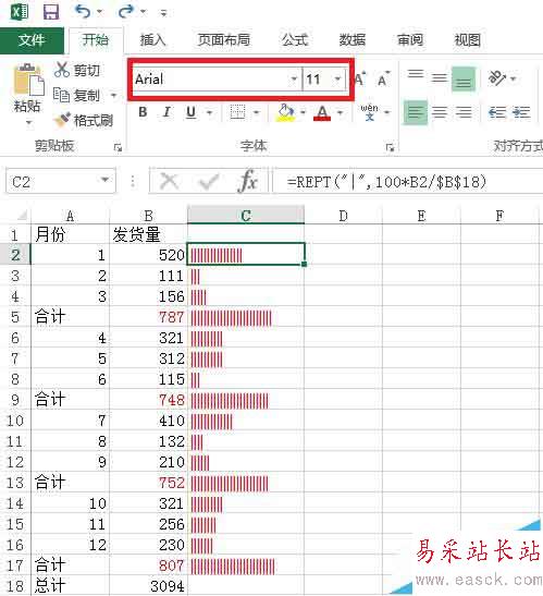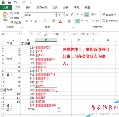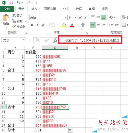 1、輸入公式=REPT("|",100*B2/$B$18)