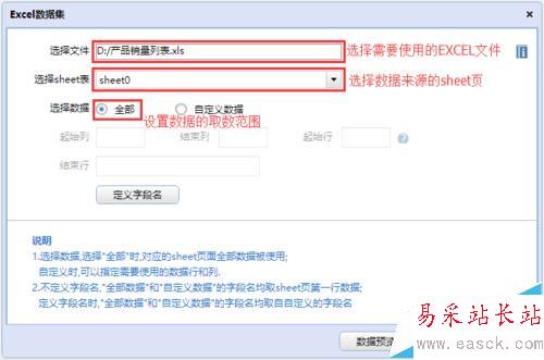 2、設置EXCEL數據集的來源文件和取數范圍。
