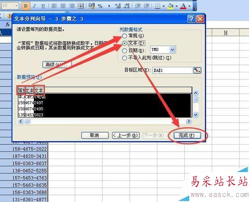 4、在文本分列向?qū)襟E之三中下面的數(shù)據(jù)預(yù)覽中可以看到通過分隔符分出的三塊數(shù)據(jù)首先點按前三個數(shù)字列最上面的列字段位置 然后點按右上方列數(shù)據(jù)格式中的常規(guī) 然后選擇被分隔符分在中間的列字段 點按列數(shù)據(jù)格式中的文本 同樣的方法設(shè)置被分隔符分在最右側(cè)的列字段再次設(shè)置列數(shù)據(jù)格式為文本 最后點按完成按鈕