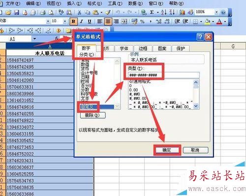 2、在彈出的單元格格式對話框中 點按數(shù)字選項卡 在左側(cè)的分類下選擇自定義 然后在右側(cè)的類型輸入框###-####-#### #代表的是一位數(shù)字 但是當(dāng)首位是0時候這個0將不顯示 所以如果以0開頭的數(shù)字需要這樣設(shè)置0##-####-####