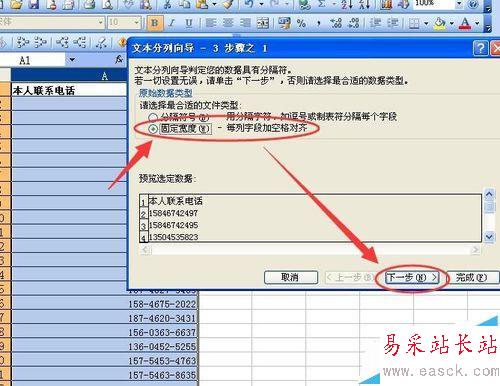 2、在彈出的文本分類向?qū)υ捒蛑械娜襟E之一下的原始數(shù)據(jù)類型 合適的文本類型 點選固定寬度 然后點按下一步