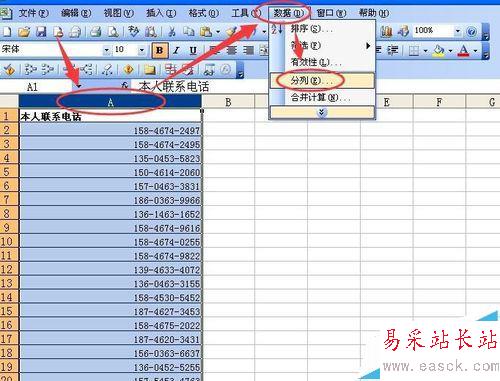 1、下面用第二種方法對該列進(jìn)行設(shè)置 首先選中a列 點按a列列標(biāo) 然后菜單欄下的數(shù)據(jù)命令 在彈出的菜單中點按分列命令