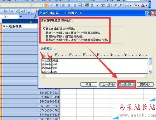 3、在接下來的文本分列向?qū)襟E之二中通過如箭頭所在位置點按鼠標(biāo)左鍵設(shè)置字段寬度 字段的寬度決定列分列后包含的內(nèi)容長度 點選幾下就會分為幾個字段 如果點按的位置出現(xiàn)錯誤或者多點生成了多余的分列線 可以再次雙擊分列線即可刪除該分列線 如果要移動分列線 可以鼠標(biāo)左鍵按下分列線并左右拖動即可調(diào)整分列線位置 之后點按下一步