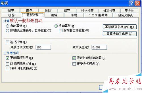 6、在“重新計算”標簽中。檢查你的電腦設置。默認應該是“自動重算”這個設置。