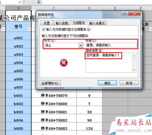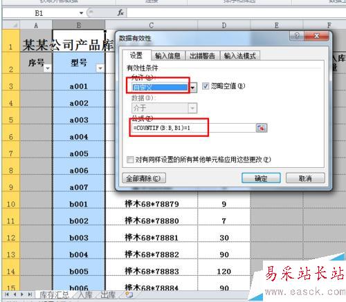 然后選中型號列,將型號列設置為型號輸入唯一性(避免重復統計):