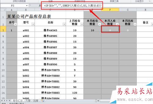 F3單元格中輸入此公式: =IF(B3="","",SUMIF(入庫!C:C,B3,入庫!E:E))