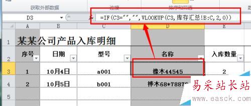 D3單元格中輸入此公式:=IF(C3="","",VLOOKUP(C3,庫存匯總!B:C,2,0))