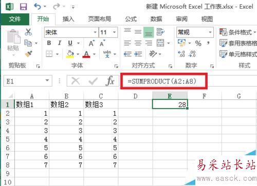 =sumproduct({1;2;3;4;5;6;7},{1;2;3;4;5;6;7})=1*1+2*2+3*3+4*4+5*5+6*6+7*7=140。