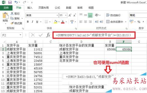 =sumproduct((A2:A13="成都發貨平臺")*(B2:B13))