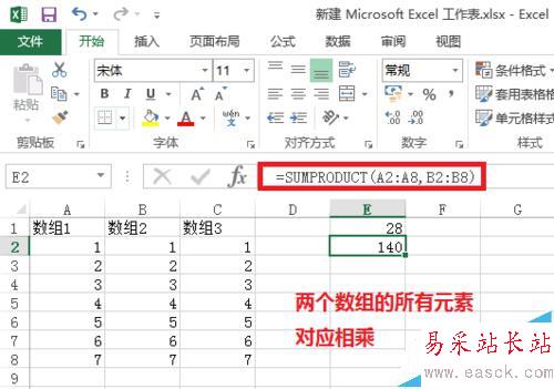 2、當sumproduct函數中參數為兩個數組時,兩個數組的所有元素對應相乘。