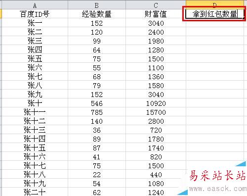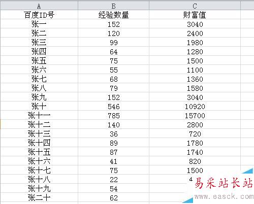 1、首先打開(kāi)2個(gè)excel表格(如圖一、圖二),會(huì)發(fā)現(xiàn)這兩個(gè)excel表格的A列是相同類型的,都是”百度ID號(hào)“,不同的是表格1有經(jīng)驗(yàn)數(shù)量和財(cái)富值,而表格2有的是最近拿好經(jīng)驗(yàn)紅包的數(shù)量,現(xiàn)在就是需要把2個(gè)excel合并成一個(gè)表格。
