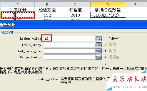 5、彈出來(lái)的函數(shù)參數(shù)中,在第一個(gè)填寫(xiě)框vlookup_value中直接點(diǎn)擊A2的”張一”。(如下圖)