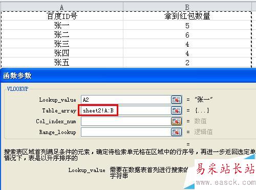 6、在第二個(gè)填寫(xiě)框Table_array中全選表格2,表格2中A列和B列都包含了。(如下圖)